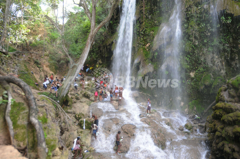 写真は、ハイチの首都ポルトープランス(Port-au-Prince)から約68キロ、ブードゥー教の年中行事が行われる街ソー・ドー(Saut d'Eau)を目指し、滝で身を清め恍惚状態になる巡礼者たち(2010年7月16日撮影)。(c)AFP/Thony BELIZAIRE