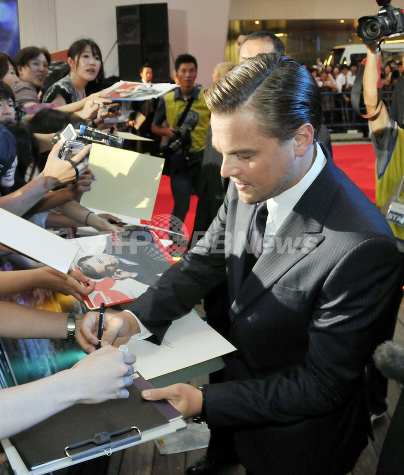 レオナルド・ディカプリオ(Leonardo DiCaprio)と渡辺謙(Ken Watanabe)が共演した米映画『インセプション(Inception)』のジャパンプレミアが20日、都内で行われた。日本公開は23日から。写真は、レッドカーペットでファンにサインをするディカプリオ(2010年7月20日撮影)。(c)AFP/Yoshikazu TSUNO