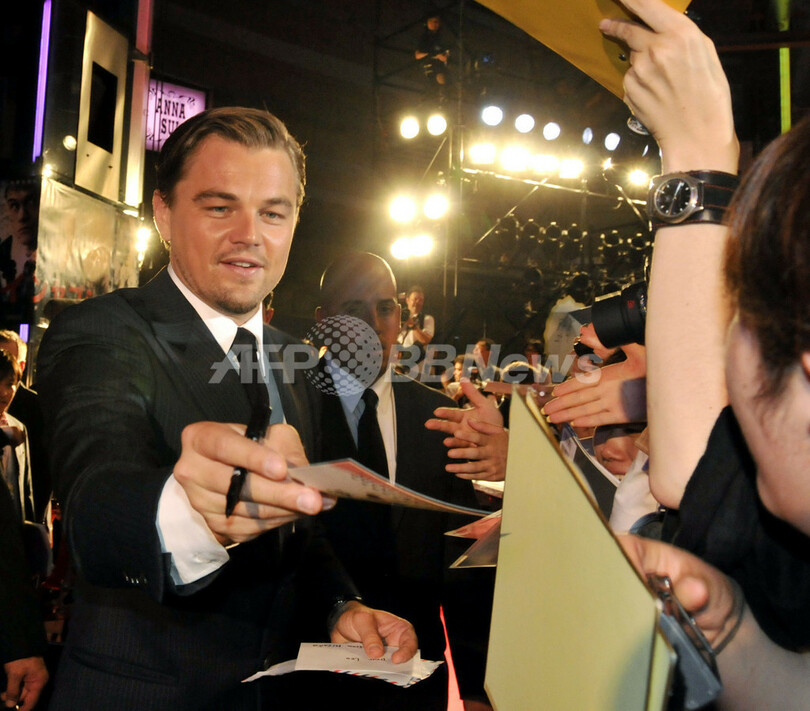 レオナルド・ディカプリオ(Leonardo DiCaprio)と渡辺謙(Ken Watanabe)が共演した米映画『インセプション(Inception)』のジャパンプレミアが20日、都内で行われた。日本公開は23日から。写真は、レッドカーペットでファンにサインをするディカプリオ(2010年7月20日撮影)。(c)AFP/Yoshikazu TSUNO