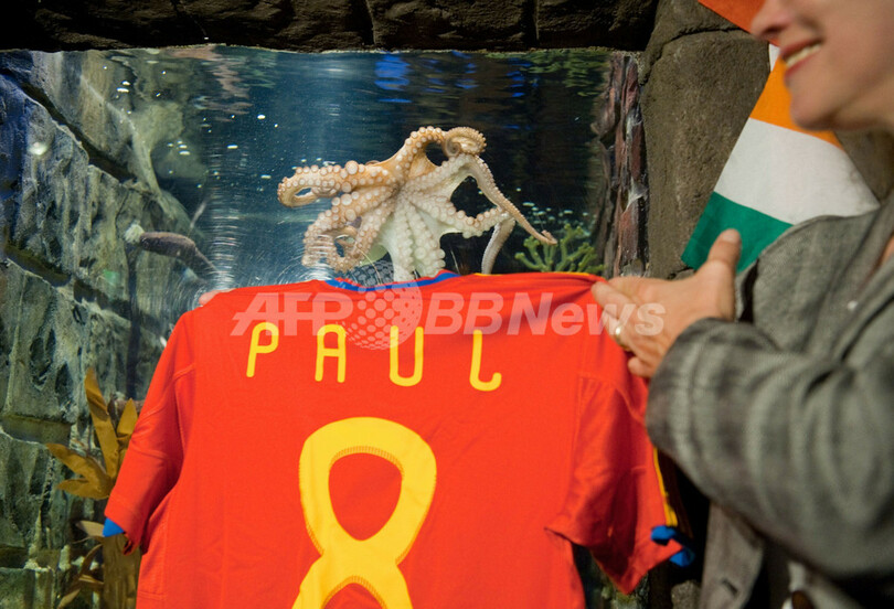独オーバーハウゼン(Oberhausen)の水族館「シーライフ(Sea Life)」に飼育されているパウルは、今年のW杯でドイツがスペインに敗戦した準決勝を含むドイツ代表の全試合7試合と、スペイン勝利を予言した決勝の全占いを的中させ、一躍国際的なスターとなった。感謝のギフトは、「タコ祭り」で知られるスペイン、ガリシア(Galicia)地方オ・カルバジーニョ(O Carballino)村の特使が届けた。(c)AFP