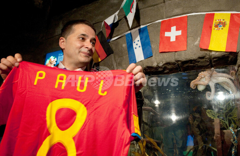 独オーバーハウゼン(Oberhausen)の水族館「シーライフ(Sea Life)」に飼育されているパウルは、今年のW杯でドイツがスペインに敗戦した準決勝を含むドイツ代表の全試合7試合と、スペイン勝利を予言した決勝の全占いを的中させ、一躍国際的なスターとなった。感謝のギフトは、「タコ祭り」で知られるスペイン、ガリシア(Galicia)地方オ・カルバジーニョ(O Carballino)村の特使が届けた。(c)AFP