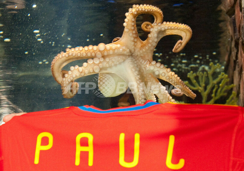 独オーバーハウゼン(Oberhausen)の水族館「シーライフ(Sea Life)」に飼育されているパウルは、今年のW杯でドイツがスペインに敗戦した準決勝を含むドイツ代表の全試合7試合と、スペイン勝利を予言した決勝の全占いを的中させ、一躍国際的なスターとなった。感謝のギフトは、「タコ祭り」で知られるスペイン、ガリシア(Galicia)地方オ・カルバジーニョ(O Carballino)村の特使が届けた。(c)AFP
