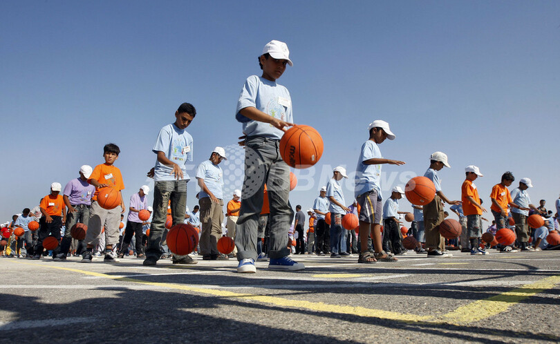 【7月23日 AFP】1度に7500個のバスケットボールをドリブルするギネス世界記録(Guiness Book of Records)に挑戦するイベントが22日、国連パレスチナ難民救済事業機関(UNRWA)の主催で、パレスチナ自治区ガザ地区(Gaza Strip)のラファ(Rafah)で行われた。2005年にイスラエル軍戦車の砲弾によって左腕を失った14歳のMoath Najjarさんも参加した。(c)AFP
