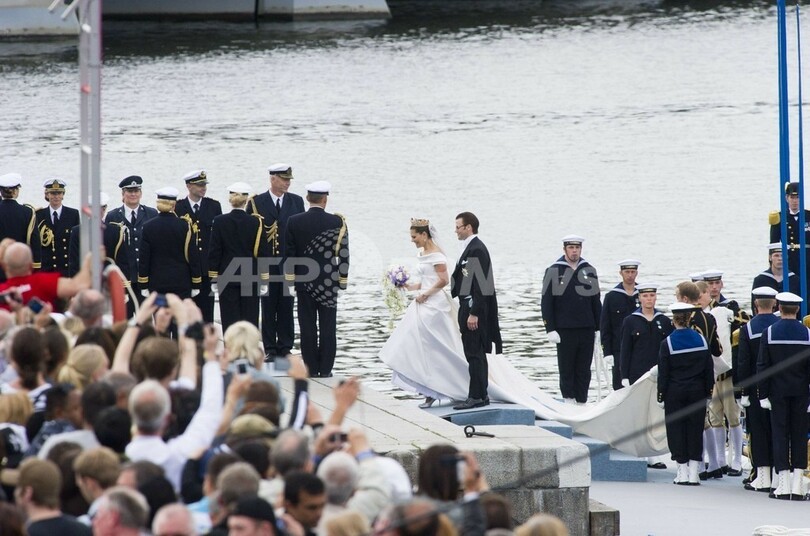 ストックホルム大聖堂で6月半ばに行われた式で、ビクトリア王女は、ラインストーンのバックルがアクセントになった“ベル ドゥニュイ”パンプスを着用。ウェディングドレスと同じホワイトシルクサテン地で作られている。