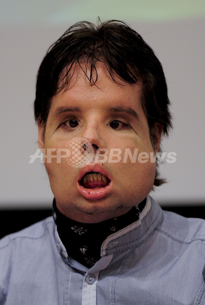 【7月27日 AFP】スペイン・バルセロナ(Barcelona)で26日、世界初の顔面完全移植手術を受けた男性が記者会見を行い、テレビカメラの前で、医師や顔面を提供したドナーの家族に感謝の言葉を述べた。