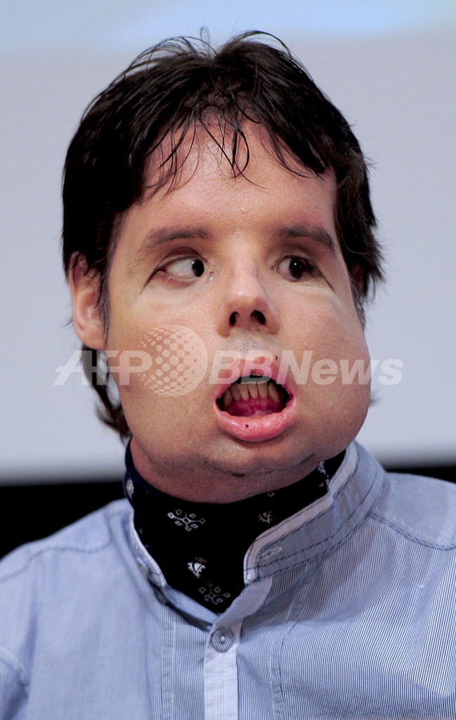 【7月27日 AFP】スペイン・バルセロナ(Barcelona)で26日、世界初の顔面完全移植手術を受けた男性が記者会見を行い、テレビカメラの前で、医師や顔面を提供したドナーの家族に感謝の言葉を述べた。