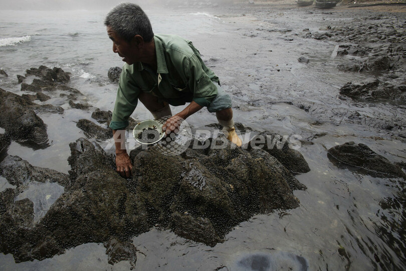 写真は、環境保護団体グリーンピース(Greenpeace)が公開した、大連新港から約1キロ離れた養殖場で、流出原油によって死んだ巻き貝を回収する従業員(2010年7月21日撮影、同22日提供)。(c)AFP/GREENPEACE/Jiang He