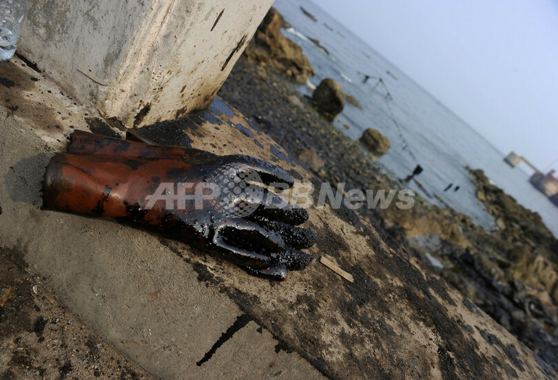 写真は、大連新港に置かれた原油まみれの手袋(2010年7月26日撮影)。(c)AFP/LIU Jin