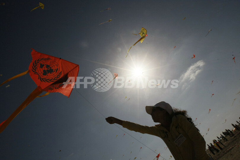 【7月30日 AFP】パレスチナ自治区ガザ市(Gaza City)で29日、「一斉たこ揚げ」のギネス世界記録(Guinness World Record)に挑戦するイベントが、国連パレスチナ難民救済事業機関(UNRWA)の主催で行われた。
