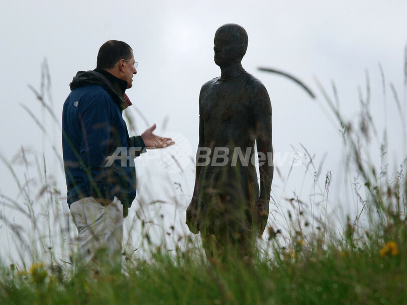 写真はゴームリー氏(左)とその作品(右、2010年7月30日撮影)。(c)AFP/JOHANNES SIMON