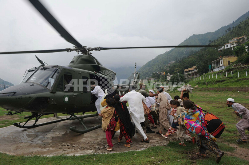 一方、共同通信(Kyodo)は、現地日本大使館筋の話として、同州を訪れていた日本人観光客8人が、洪水によって数日間にわたって足止めされ、パキスタン軍のヘリコプターで救出されたと報じた。(c)AFP/Lehaz Ali
