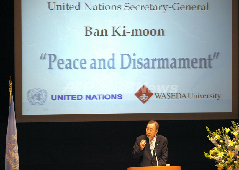 【8月4日 AFP】来日している国連(UN)の潘基文(パン・キムン、Ban Ki-moon)事務総長は4日、都内の早稲田大学(Waseda University)で「平和と軍縮」をテーマに講演した。