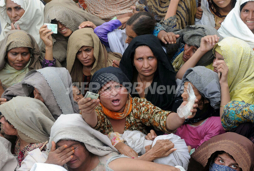 写真は、パキスタンのカイバル・パクトゥンクワ(Khyber Pakhtunkhwa)州(旧北西辺境州)の国連の難民キャンプに食糧を受け取るために集まった避難民ら(2010年8月3日撮影)。(c)AFP/A MAJEED