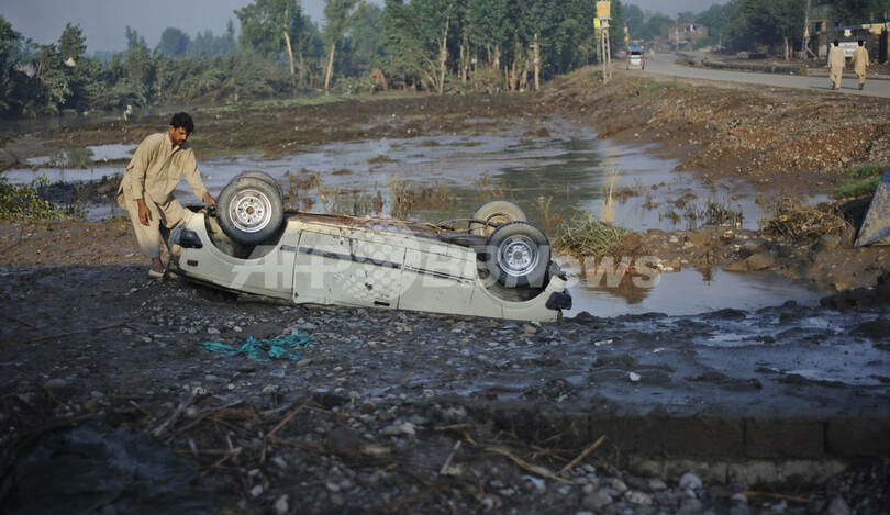 写真は、パキスタン・チャルサダ(Charsadda)で洪水に押し流されひっくり返った車(2010年8月4日撮影)。(c)AFP/Farooq NAEEM