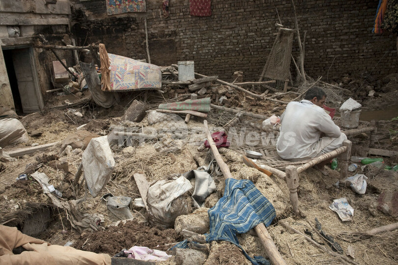 写真は、洪水に見舞われたパキスタン北西部カイバル・パクトゥンクワ(Khyber Pakhtunkhwa)州(旧北西辺境州)ノウシェラ(Nowshera)郊外のMohib Bandaで、倒壊した住宅のベッドに座る男性(2010年8月6日撮影)。(c)AFP/BEHROUZ MEHRI