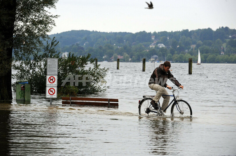 写真は、ドイツ南部シュタンベルク(Starnberg)にあるシュタンベルク湖(Starnberger See)そばの冠水した道路を自転車で通過する男性(2010年8月7日撮影)。(c)AFP/ANDREAS GEBERT
