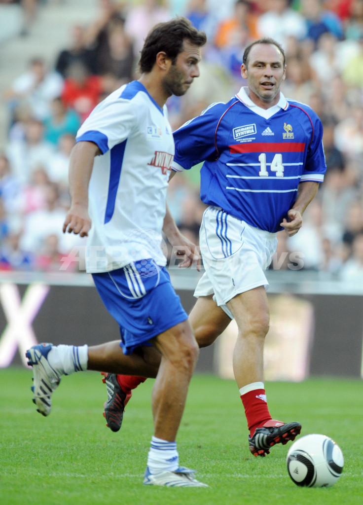 2月に欧州西部を襲ったハリケーン級暴風雨「シンシア(Xynthia)」の被災者支援のチャリティーマッチが8日、フランス・ナント(Nantes)のスタッド・ドゥ・ラ・ボージョワール(Stade de la Beaujoire - Louis Fonteneau)で行われ、ジネディーヌ・ジダン(Zinedine Zidane)氏ら1998年のW杯で優勝したフランス代表のメンバーが参加した。写真は欧州選抜のルイ・バロス(Rui Gil Soares de Barros)をマークするアラン・ボゴシアン(Alain Boghossian、右)。(2010年8月8日撮影)(c)AFP/FRANK PERRY