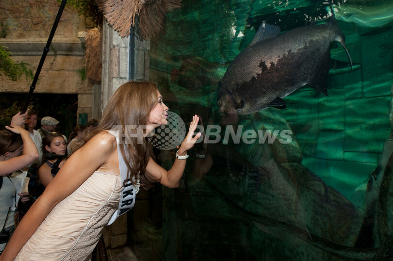 写真は、マンダレイ・ベイ・リゾート&カジノの水族館「シャークリーフ(Shark Reef )」で魚を見学するウクライナ代表のAnna Poslavskaさん(2010年8月10日撮影)。(c)AFP/Miss Universe Organization LP, LLLP/Darren DECKER