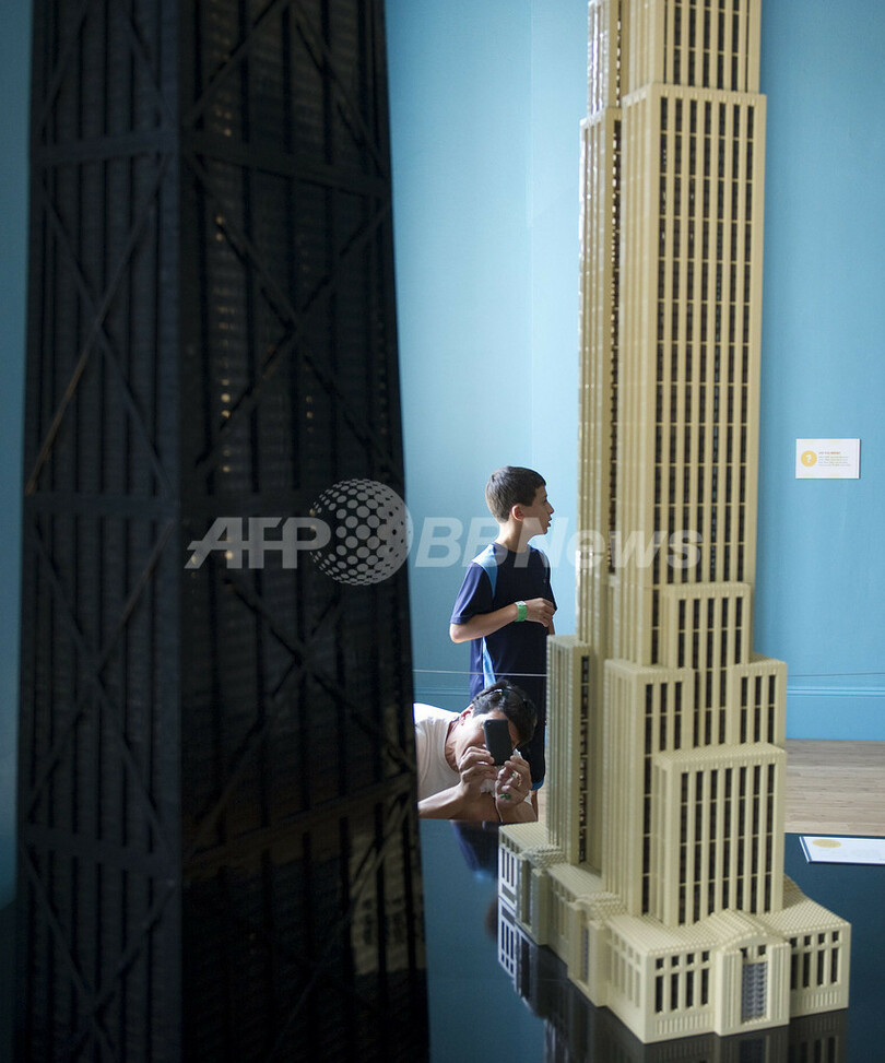 写真は、同展会場で、レゴで作られたシカゴ(Chicago)のジョン・ハンコック・センター(John Hancock Center)ビルを撮影する観光客(2010年8月10日撮影)。(c)AFP/Jim WATSON