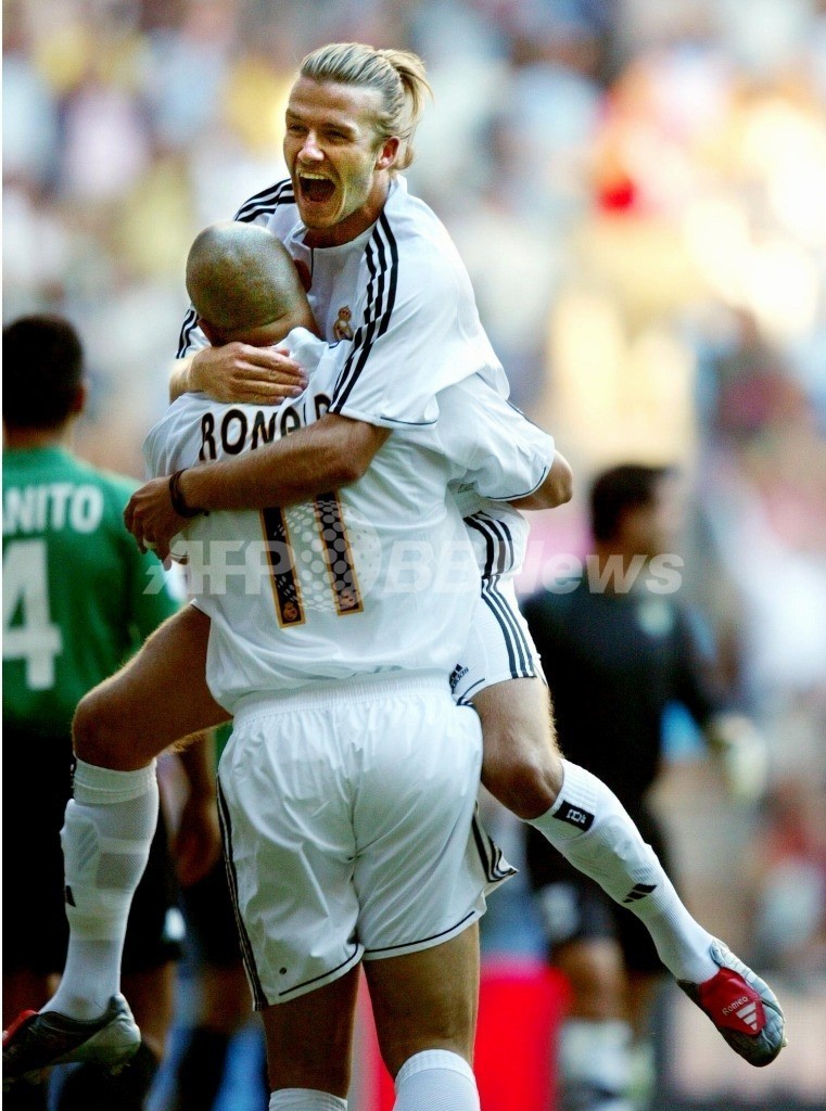 スペイン・マドリード(Madrid)のサンチャゴ・ベルナベウ(Santiago Bernabeu Stadium)で行われた2003-04スペイン1部リーグ、レアル・マドリード(Real Madrid)対レアル・ベティス(Real Betis)の試合で、移籍後初ゴールを決め、チームメートのロナウド(Ronaldo、下)と喜ぶレアル・マドリードのデビッド・ベッカム(David Beckham、2003年8月30日撮影)。(c)AFP