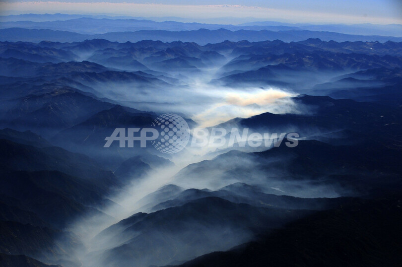 米大統領専用機エアフォースワン(Air Force One)から撮影した、霧のかかった米カリフォルニア(California)州シエラネバダ山脈(Serra Nevada Mountains、2010年8月17日撮影)。(c)AFP/Jewel Samad