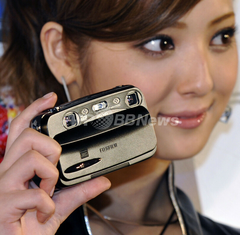 写真は、都内の富士フイルム本社で行われた製品発表会で、「FinePix Real 3D W3」を披露する佐々木希(2010年8月17日撮影)。(c)AFP/Kazuhiro NOGI