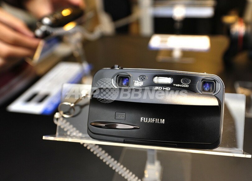 写真は、都内の富士フイルム本社で行われた製品発表会で展示される「FinePix Real 3D W3」(2010年8月17日撮影)。(c)AFP/Kazuhiro NOGI