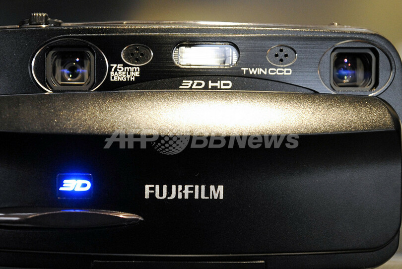 写真は、都内の富士フイルム本社で行われた製品発表会で展示される「FinePix Real 3D W3」(2010年8月17日撮影)。(c)AFP/Kazuhiro NOGI
