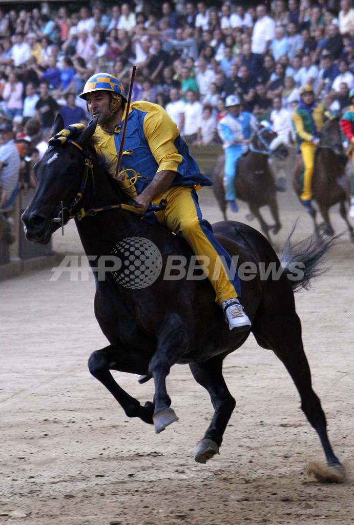 写真は、カンポ広場で開催される「パリオ」で優勝したカメ地区の騎手Luigi Bruschelliさんと馬Istriceddu(2010年8月16日撮影)。(c)AFP/FABIO MUZZI