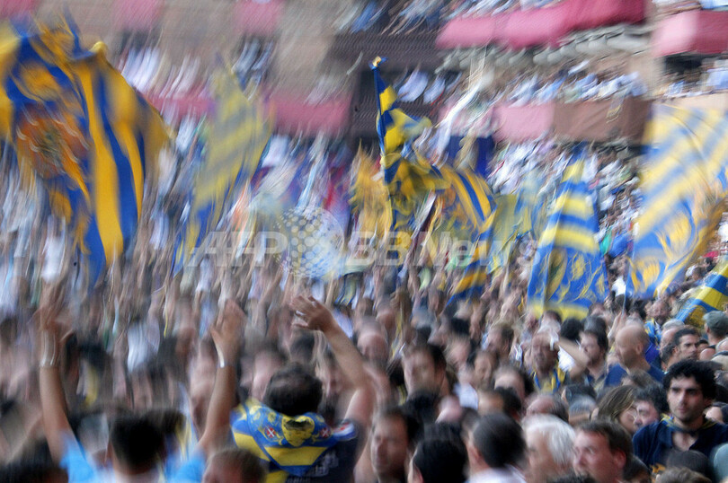 【8月18日 AFP】イタリア・トスカーナ地方の町、シエナ(Siena)のカンポ広場(Piazza del Campo)で16日、伝統競馬「パリオ(Palio)」が開催された。パリオは年2回、同広場で開催され、騎手は鞍(くら)なしで馬に乗り、会場に設置されたコースを1周して競う。(c)AFP