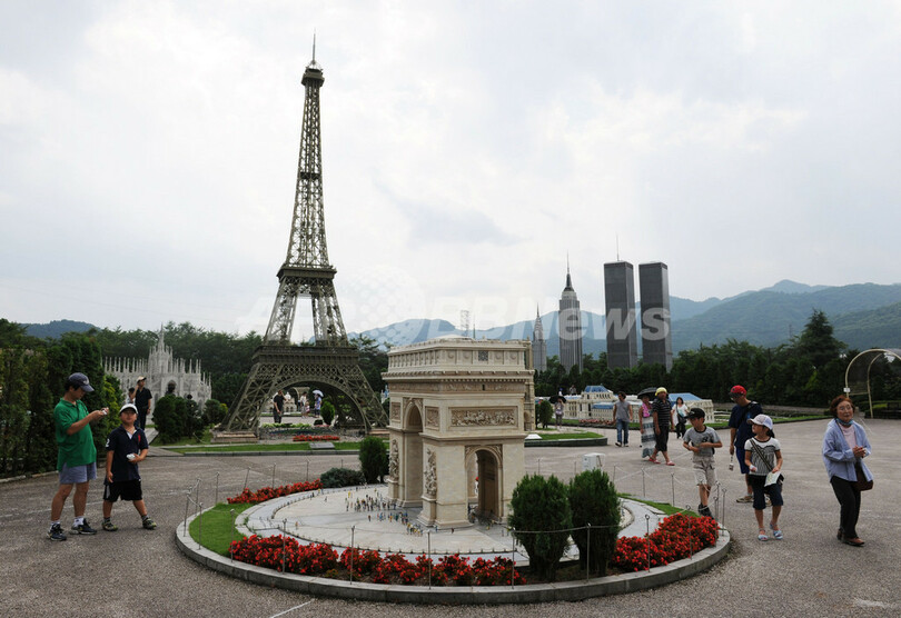 写真は、フランス・凱旋門(中央、Arc de Triomphe)とエッフェル塔(左、Eiffel Tower)の縮尺模型(2010年8月16日撮影)。(c)AFP/TOSHIFUMI KITAMURA