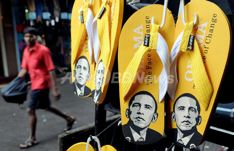【8月19日 AFP】バラク・オバマ(Barrack Obama)米大統領の絵が印刷されたビーチサンダルが、インド・ムンバイ(Mumbai)中心部にある靴店「カンブル・シューズ(Kamble Shoes)」でよく売れている。サンダルは中国製で、価格は1足249ルピー(約460円)。前週だけで100足近く売れ、店に残っているのは4足だけ。同店は需要が大きいとして、ビーチサンダルを追加注文したという。(c)AFP