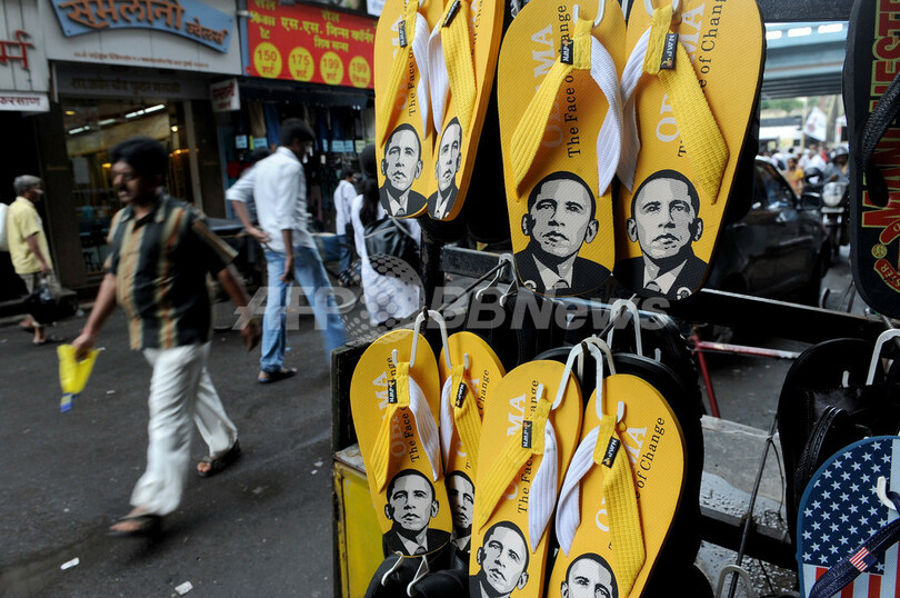 【8月19日 AFP】バラク・オバマ(Barrack Obama)米大統領の絵が印刷されたビーチサンダルが、インド・ムンバイ(Mumbai)中心部にある靴店「カンブル・シューズ(Kamble Shoes)」でよく売れている。サンダルは中国製で、価格は1足249ルピー(約460円)。前週だけで100足近く売れ、店に残っているのは4足だけ。同店は需要が大きいとして、ビーチサンダルを追加注文したという。(c)AFP