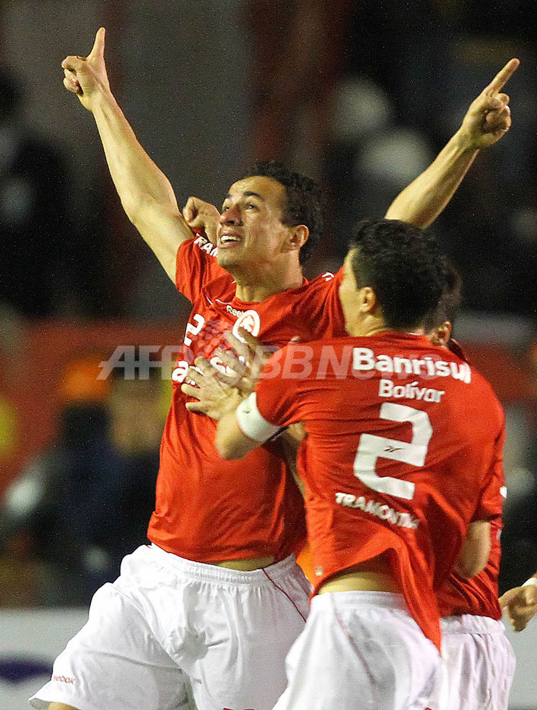 サッカーリベルタドーレス杯2010(Copa Libertadores de America 2010)は18日、決勝の第2戦がブラジルのポルトアレグレ(Porto Alegre)で行われ、インテルナシオナウ(Internacional、ブラジル)がCDグアダラハラ(Club Deportivo Guadalajara、メキシコ)を3-2で下し、2試合合計5-3で2度目の優勝を果たした。写真は後半30分に逆転ゴールを決め、チームメイトと喜ぶインテルナシオナウのレアンドロ・ダミオン(Leandro Damiao da Silva dos Santos、左)。(2010年8月18日撮影)(c)AFP/JEFFERSON BERNARDES