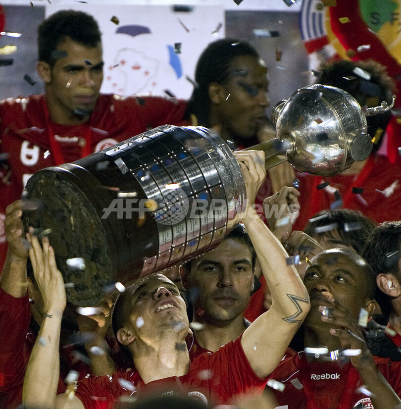 サッカーリベルタドーレス杯2010(Copa Libertadores de America 2010)は18日、決勝の第2戦がブラジルのポルトアレグレ(Porto Alegre)で行われ、インテルナシオナウ(Internacional、ブラジル)がCDグアダラハラ(Club Deportivo Guadalajara、メキシコ)を3-2で下し、2試合合計5-3で2度目の優勝を果たした。写真は優勝し、トロフィーを掲げるインテルナシオナウのアンドレス・ダレッサンドロ(Andres D'Alessandro)。(2010年8月18日撮影)(c)AFP/ANTONIO SCORZA