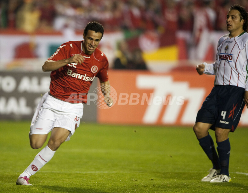 サッカーリベルタドーレス杯2010(Copa Libertadores de America 2010)は18日、決勝の第2戦がブラジルのポルトアレグレ(Porto Alegre)で行われ、インテルナシオナウ(Internacional、ブラジル)がCDグアダラハラ(Club Deportivo Guadalajara、メキシコ)を3-2で下し、2試合合計5-3で2度目の優勝を果たした。写真は後半30分に逆転ゴールを決めて喜ぶインテルナシオナウのレアンドロ・ダミアン(Leandro Damiao da Silva dos Santos、左)。(2010年8月18日撮影)(c)AFP/ANTONIO SCORZA