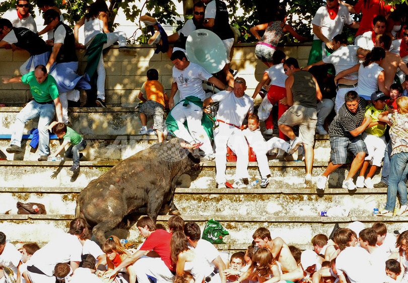 【8月20日 AFP】スペイン北部タファリャ(Tafalla)の闘牛場で18日夜、牛が客席に飛び込んで恐怖におののく観客に襲いかかり、32人が負傷した。10歳の男の子を含む3人が重傷で、病院で手当を受けているという。