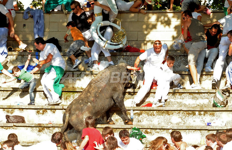 【8月20日 AFP】スペイン北部タファリャ(Tafalla)の闘牛場で18日夜、牛が客席に飛び込んで恐怖におののく観客に襲いかかり、32人が負傷した。10歳の男の子を含む3人が重傷で、病院で手当を受けているという。