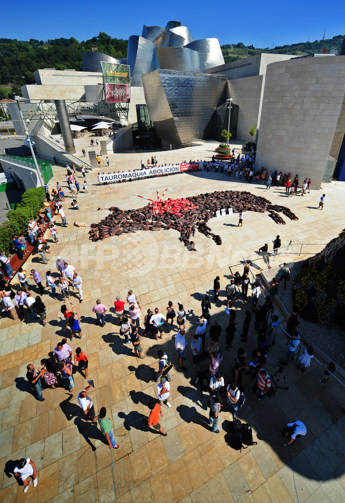 スペイン北部バスク(Basque)地方のビルバオ(Bilbao) で21日、動物愛護団体「Anima Naturalis, Equanimal」と「CAS International」のメンバーが、赤や黒色に塗った体をグッゲンハイム美術館(Guggenheim Museum Bilbao)前の路上に横たえて巨大な殺されたウシの姿を形作り、闘牛に反対するパフォーマンスを行った。ビルバオでは、毎夏開かれる「Aste Nagusia」祭りで闘牛が行われる(2010年8月21日撮影)。(c)AFP/ RAFA RIVAS