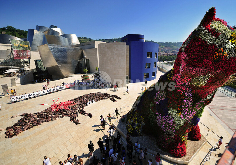 スペイン北部バスク(Basque)地方のビルバオ(Bilbao) で21日、動物愛護団体「Anima Naturalis, Equanimal」と「CAS International」のメンバーが、赤や黒色に塗った体をグッゲンハイム美術館(Guggenheim Museum Bilbao)前の路上に横たえて巨大な殺されたウシの姿を形作り、闘牛に反対するパフォーマンスを行った。ビルバオでは、毎夏開かれる「Aste Nagusia」祭りで闘牛が行われる(2010年8月21日撮影)。(c)AFP/ RAFA RIVAS