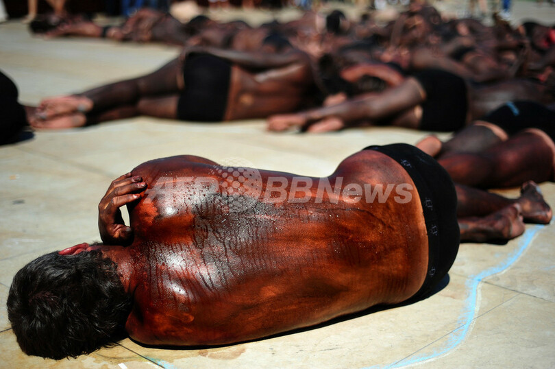 スペイン北部バスク(Basque)地方のビルバオ(Bilbao) で21日、動物愛護団体「Anima Naturalis, Equanimal」と「CAS International」のメンバーが、赤や黒色に塗った体をグッゲンハイム美術館(Guggenheim Museum Bilbao)前の路上に横たえて巨大な殺されたウシの姿を形作り、闘牛に反対するパフォーマンスを行った。ビルバオでは、毎夏開かれる「Aste Nagusia」祭りで闘牛が行われる(2010年8月21日撮影)。(c)AFP/ RAFA RIVAS