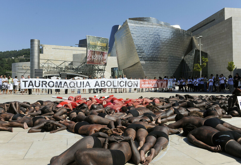 Guggenheim Museum Bilbao)前の路上に横たえて巨大な殺されたウシの姿を形作り、闘牛に反対するパフォーマンスを行った。ビルバオでは、毎夏開かれる「