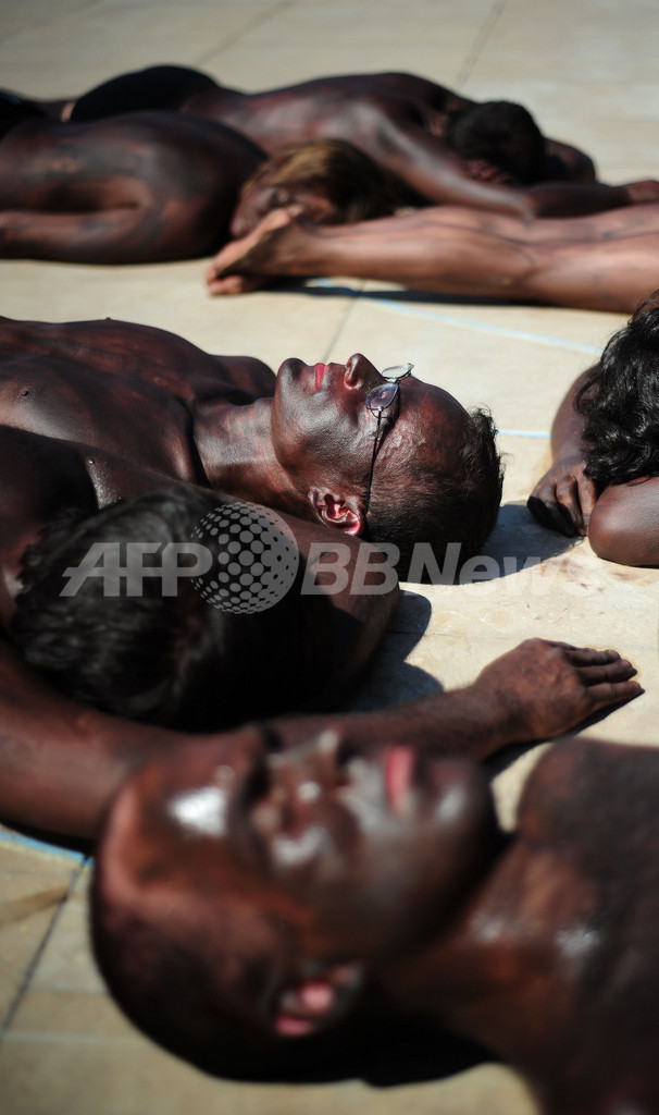 スペイン北部バスク(Basque)地方のビルバオ(Bilbao) で21日、動物愛護団体「Anima Naturalis, Equanimal」と「CAS International」のメンバーが、赤や黒色に塗った体をグッゲンハイム美術館(Guggenheim Museum Bilbao)前の路上に横たえて巨大な殺されたウシの姿を形作り、闘牛に反対するパフォーマンスを行った。ビルバオでは、毎夏開かれる「Aste Nagusia」祭りで闘牛が行われる(2010年8月21日撮影)。(c)AFP/ RAFA RIVAS