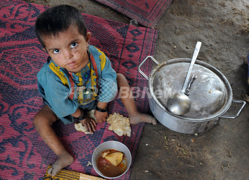 世界食糧計画(World Food Programme、WFP)は、洪水などで外部との交通が寸断された地域に食料を届けるヘリコプターが緊急に必要だと訴えるとともに、数百万匹規模の家畜にも被害が及んでいることから、飼料提供を求める緊急要請を開始したと発表した。(c)AFP/Hasan Mansoor