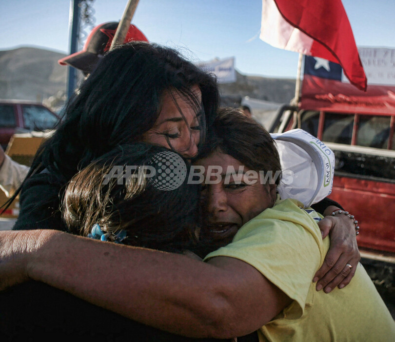 「33人はシェルターにおり、全員無事です」――セバスティアン・ピニェラ(Sebastian Pinera)大統領は同日、サンホセ(San Jose)鉱山の外で、赤い太字で書かれた手紙を大声で読み上げ、歓声を上げる家族や友人らに手紙を振って見せた。