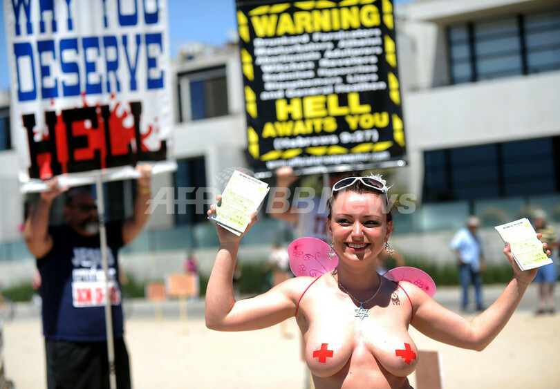 【8月23日 AFP】ロサンゼルス(Los Angeles)など全米7都市で22日、トップレスの女性たちが、公共の場で上半身裸になる権利を女性にも認めるよう訴えるデモがあった。 女性の権利平等を記念する「Women's Equality Day(女性平等の日)」を前に開催されたもので、この日を「ナショナル・ゴートップレス・デー(National Go Topless Day)」として、男性同様に女性にも「トップレス権」が憲法で保障されていると主張するイベント。「ゴートップレス」運動は、ラエリアン・ムーブメント(Raelien Movement)の指導者のフランス人、ラエル(Rael)氏が2007年に創案した。(c)AFP