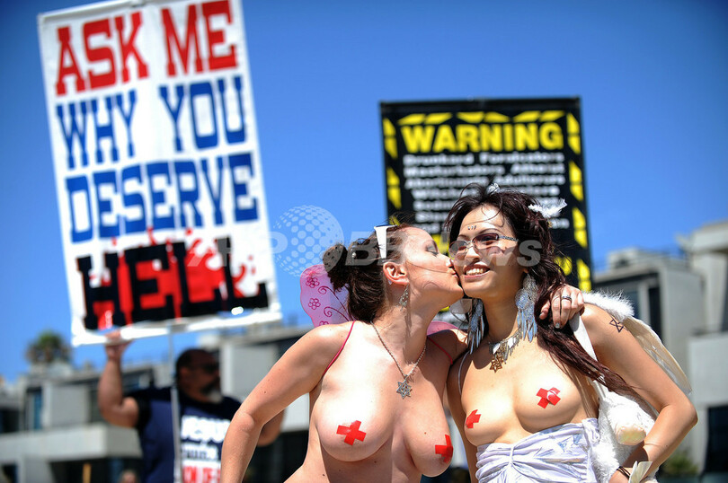 【8月23日 AFP】ロサンゼルス(Los Angeles)など全米7都市で22日、トップレスの女性たちが、公共の場で上半身裸になる権利を女性にも認めるよう訴えるデモがあった。 女性の権利平等を記念する「Women's Equality Day(女性平等の日)」を前に開催されたもので、この日を「ナショナル・ゴートップレス・デー(National Go Topless Day)」として、男性同様に女性にも「トップレス権」が憲法で保障されていると主張するイベント。「ゴートップレス」運動は、ラエリアン・ムーブメント(Raelien Movement)の指導者のフランス人、ラエル(Rael)氏が2007年に創案した。(c)AFP
