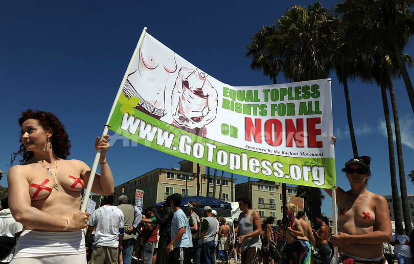 【8月23日 AFP】ロサンゼルス(Los Angeles)など全米7都市で22日、トップレスの女性たちが、公共の場で上半身裸になる権利を女性にも認めるよう訴えるデモがあった。 女性の権利平等を記念する「Women's Equality Day(女性平等の日)」を前に開催されたもので、この日を「ナショナル・ゴートップレス・デー(National Go Topless Day)」として、男性同様に女性にも「トップレス権」が憲法で保障されていると主張するイベント。「ゴートップレス」運動は、ラエリアン・ムーブメント(Raelien Movement)の指導者のフランス人、ラエル(Rael)氏が2007年に創案した。(c)AFP