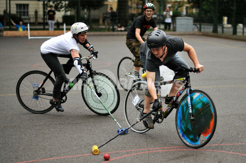 【8月23日 AFP】ロンドン(London)で21日、馬ではなく自転車でポロをする「バイクポロ」の選手権が開かれた。(c)AFP