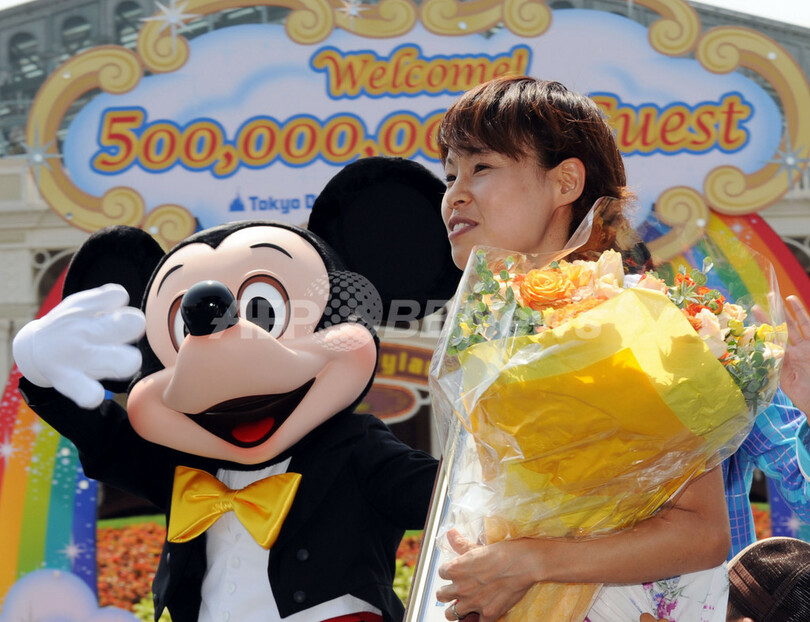 【8月27日 AFP】千葉(Chiba)県浦安(Urayasu)市の東京ディズニーランド(Tokyo Disneyland)と東京ディズニーシー(Tokyo Disney Sea)の入園者が27日、両園の開園以来合わせて5億人を超えた。5億人目の入場者は群馬県から家族4人で訪れた主婦の相馬恵(Megumi Soma)さん(38)で、ミッキーマウスとミニーマウスから歓迎を受けた。